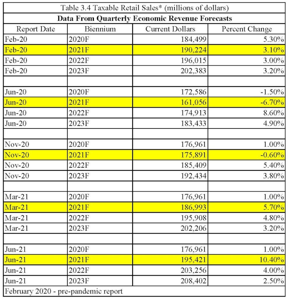 The Washington ERFC reports review new economic and revenue statistics in light of the prior forecast. How did the forecast hold up? Below is a chart showing the forecast progression for Taxable Retail Sales taken from the ERFC reports with the 2021 forecasts highlighted. The dismal June 2020 figure of negative 6.7% has been revised to a positive 5.7% in the March 2021 forecast: