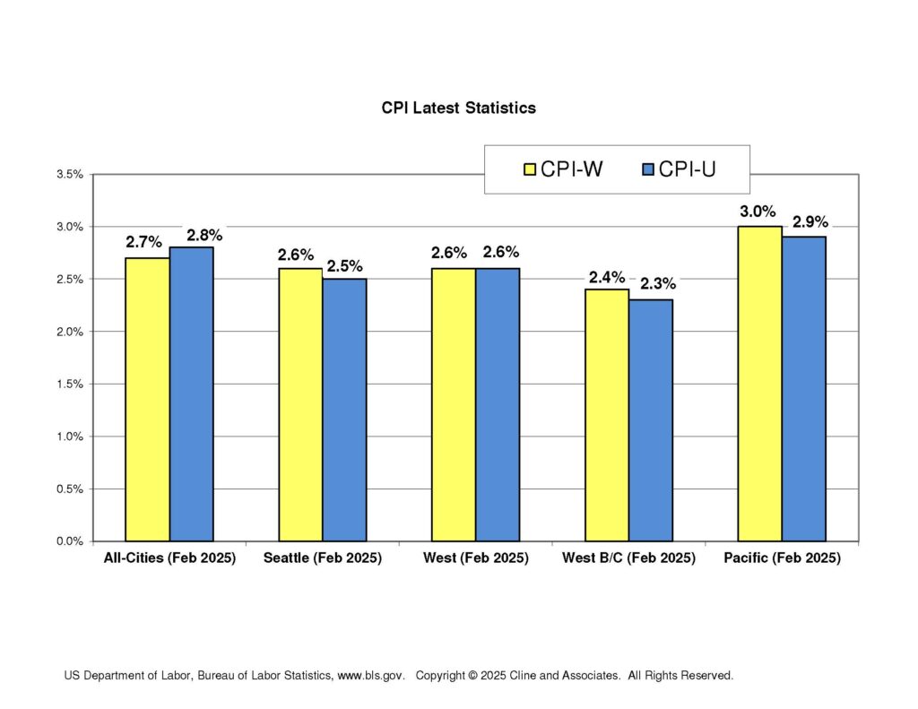 The Bureau of Labor Statistics released their bimonthly inflation report March 12 showing inflation through February. Most economists had projected that All Cities CPI would be around the 3.0% mark reported in the January inflation report but instead a slight dip was reported. Another notable trend is that, as we have been anticipating, the Seattle indices have continued to slow, and Seattle area inflation is reported as slightly less than national numbers.