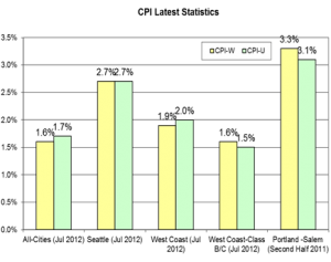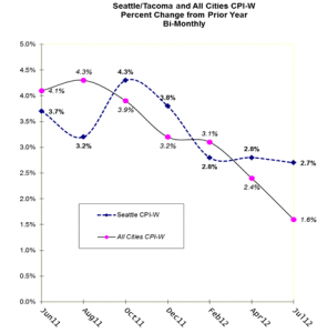 The June indices are an important factor and barometer of upcoming settlement trends. A large number of Washington public sector contracts, especially for interest arbitration eligible bargaining units, rely on the June indices. Here’s a chart showing the Seattle and All-Cities W numbers alongside some other relevant West Coast numbers: