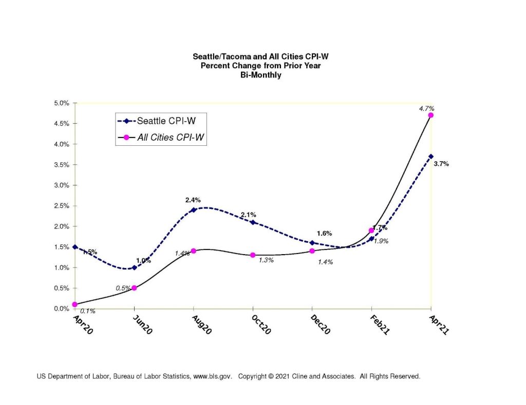 The April 2021 CPI report shows a large jump in the Seattle CPI with an even larger jump in the National CPI. The jump was expected. But the size of the increase exceeded previous predictions, including our own. And this large jump was extended in the May All Cities CPI numbers. (There are no Seattle May numbers as that index is bi-monthly.)